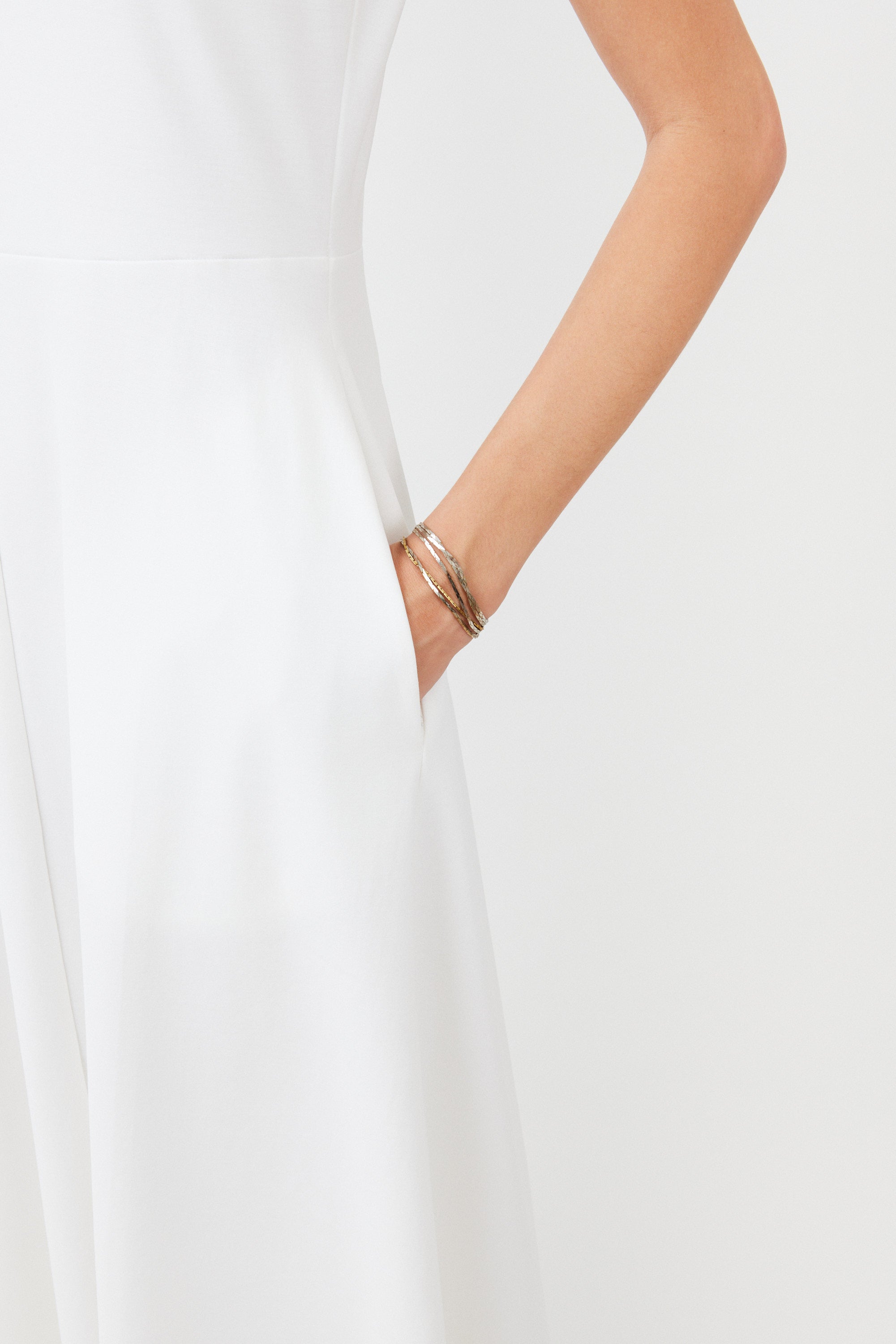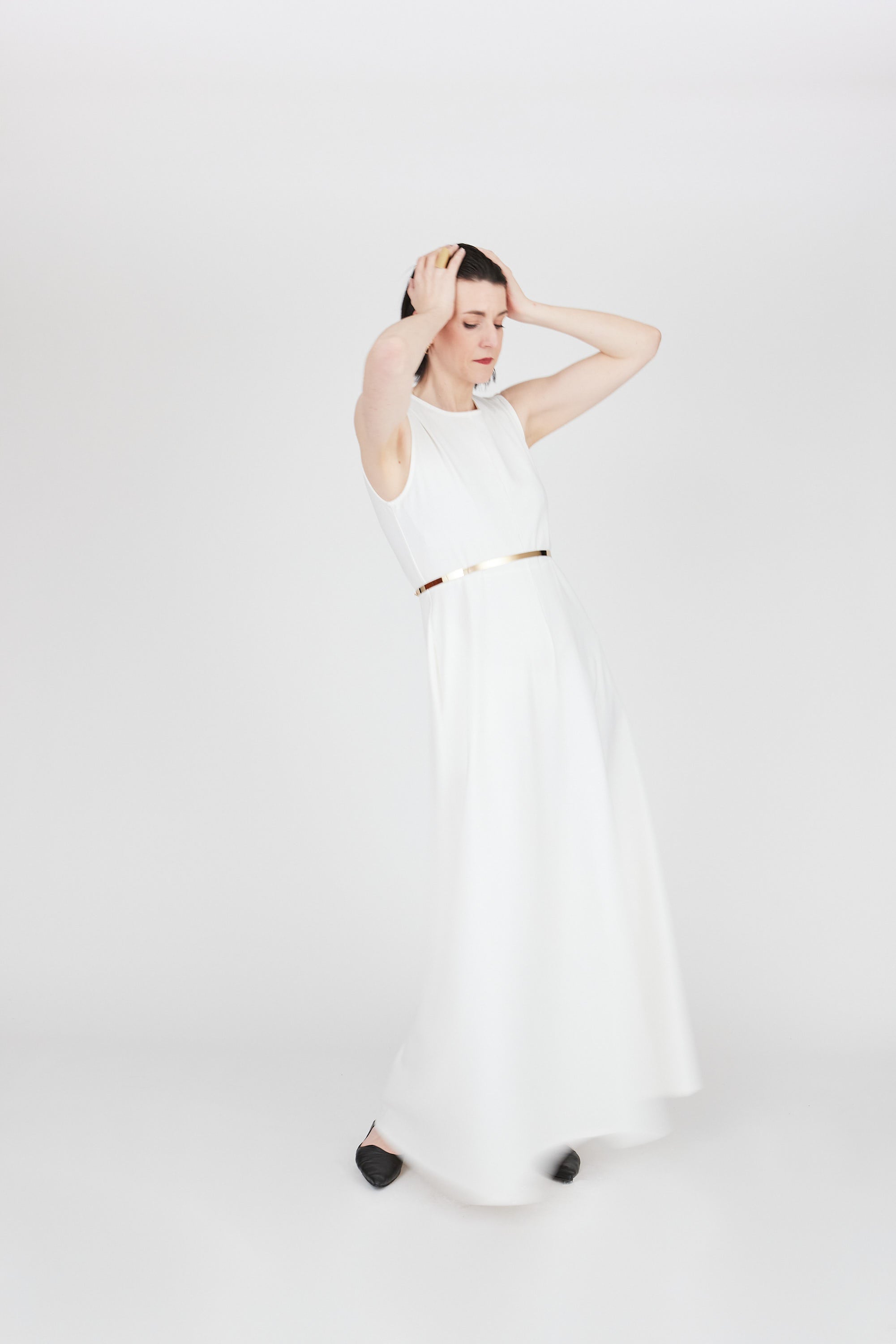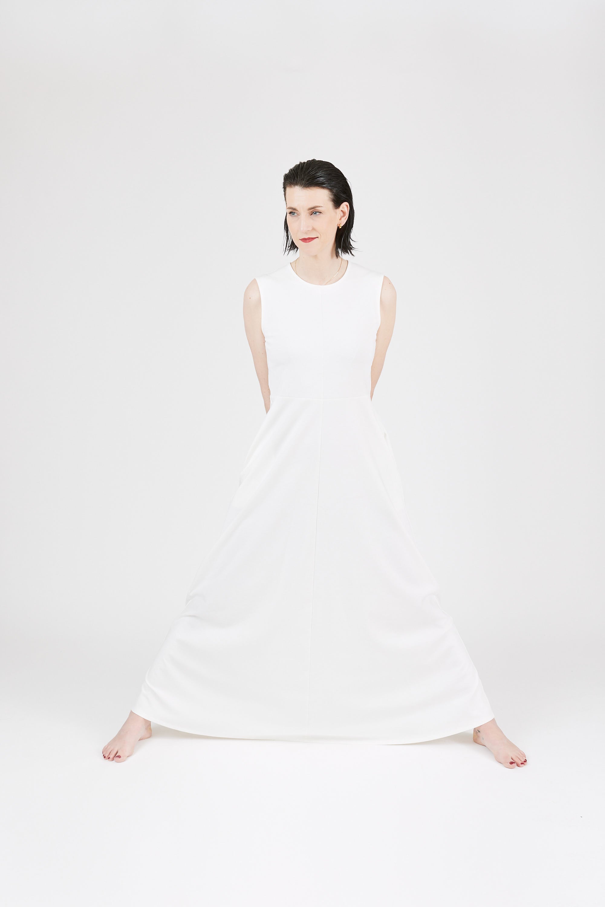 The ultimate off-white maxi dress – simple, elegant, and designed to move. Crafted from a premium cotton blend Interlook for effortless comfort, this flowing full-length dress transitions seamlessly from day to evening. Featuring a sleek high neckline, side-seam pockets, and a soft structured silhouette, it's a wardrobe essential for those who love understated luxury.