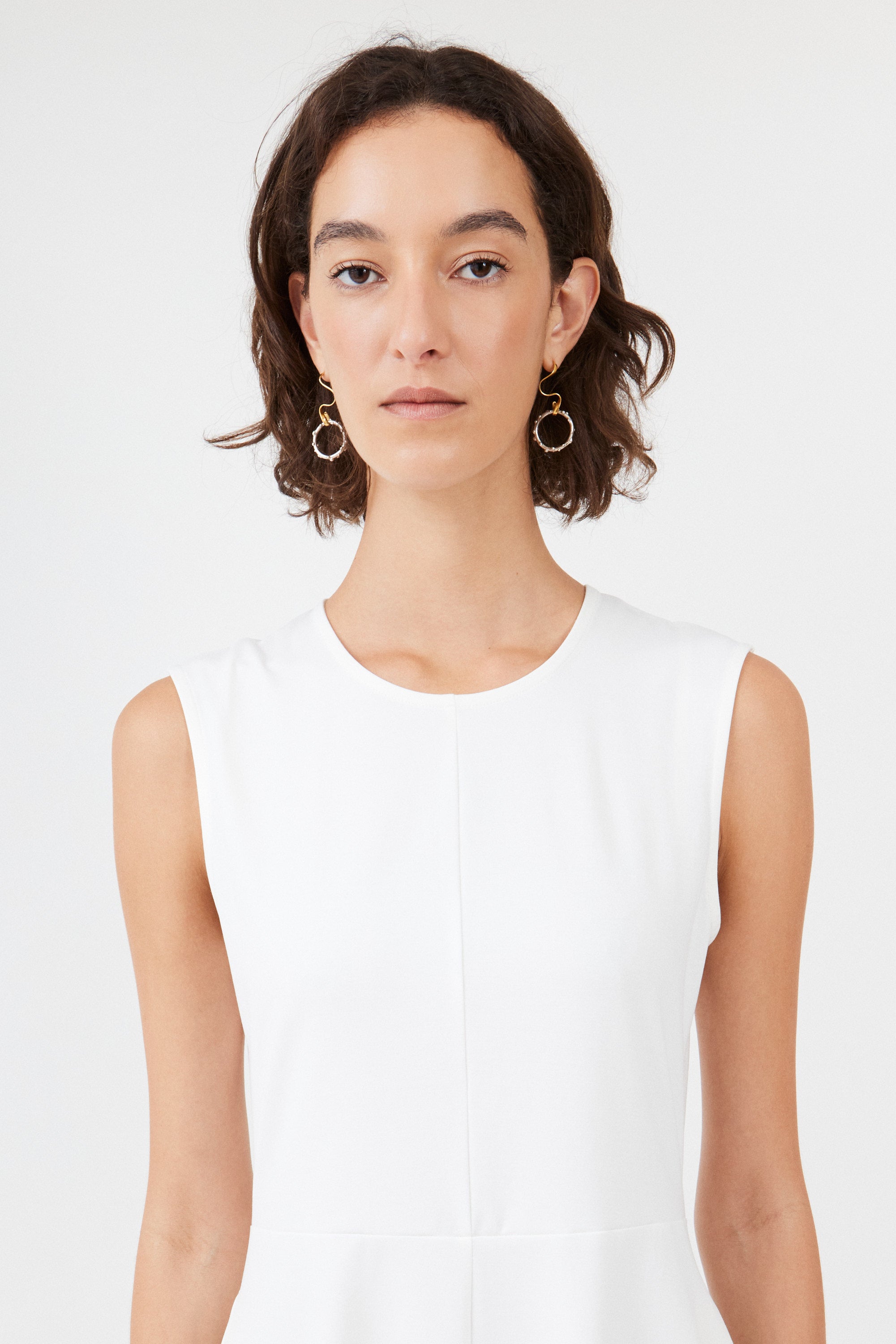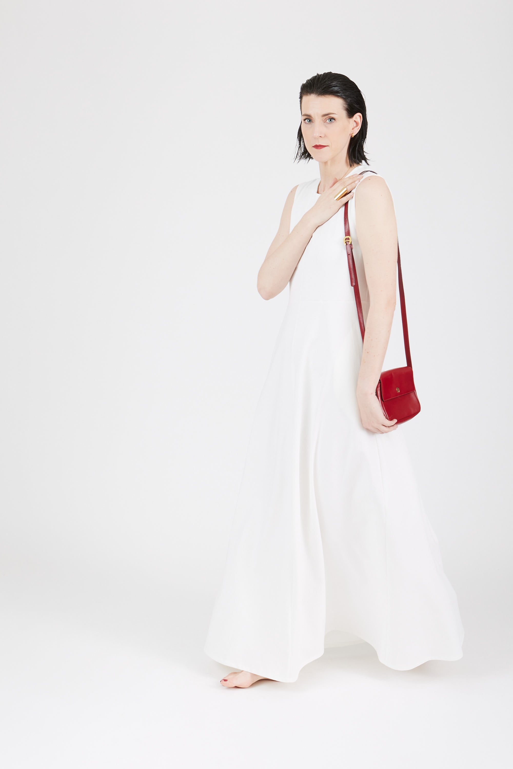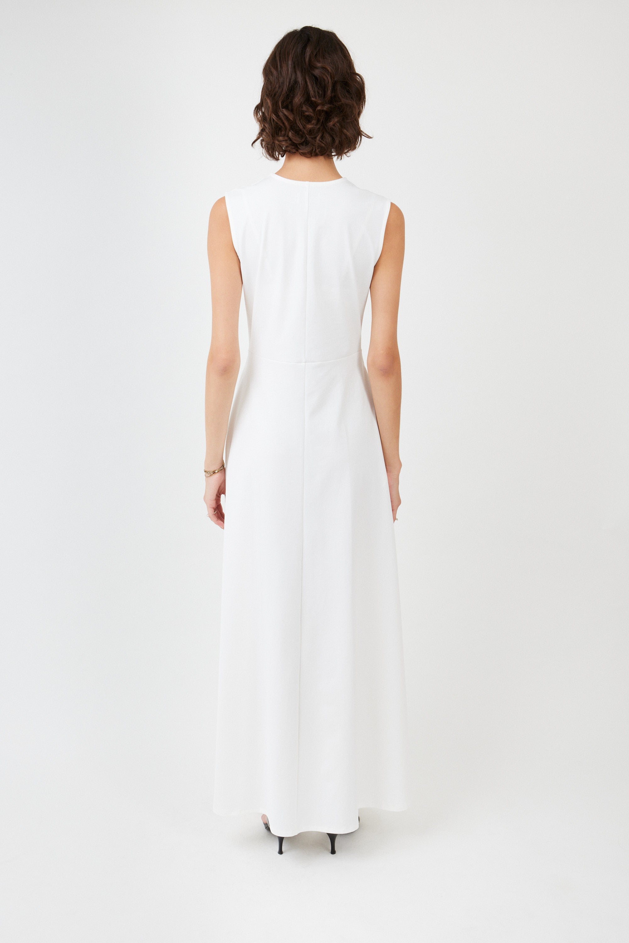 The ultimate off-white maxi dress – simple, elegant, and designed to move. Crafted from a premium cotton blend Interlook for effortless comfort, this flowing full-length dress transitions seamlessly from day to evening. Featuring a sleek high neckline, side-seam pockets, and a soft structured silhouette, it's a wardrobe essential for those who love understated luxury.