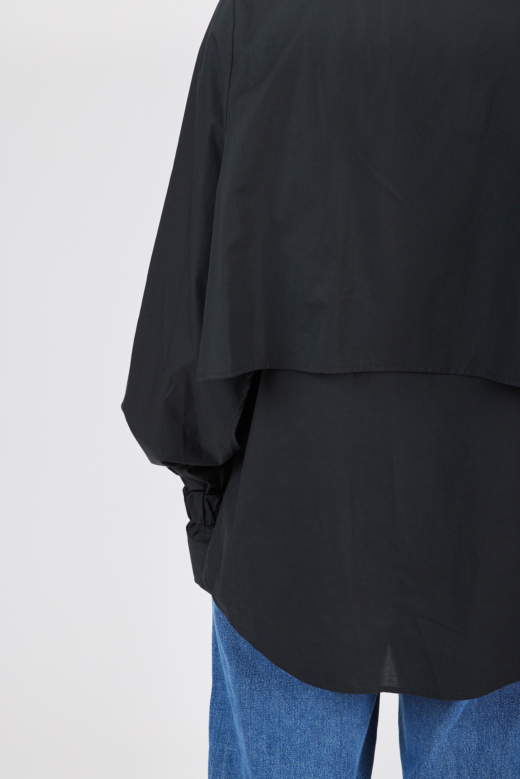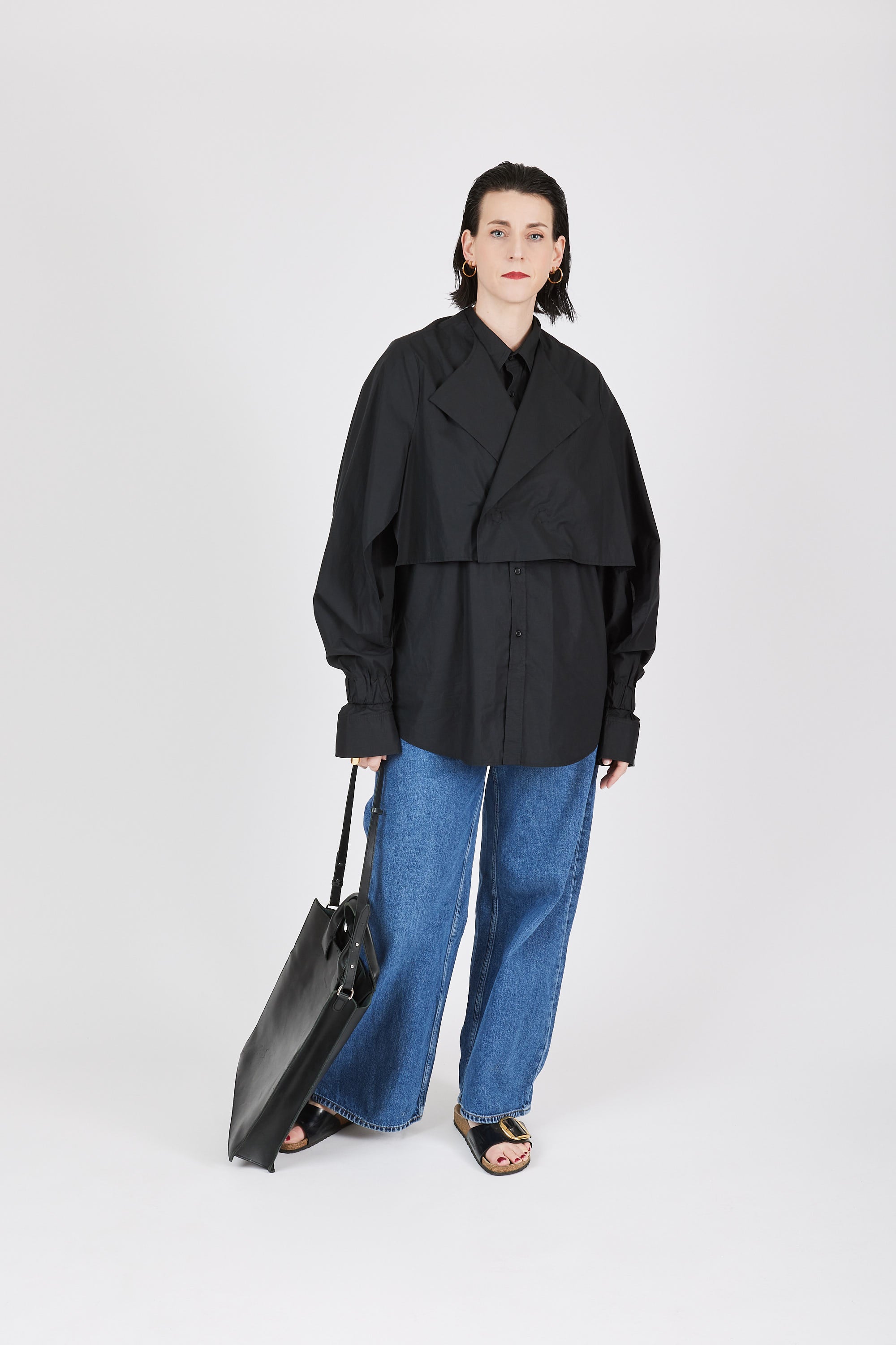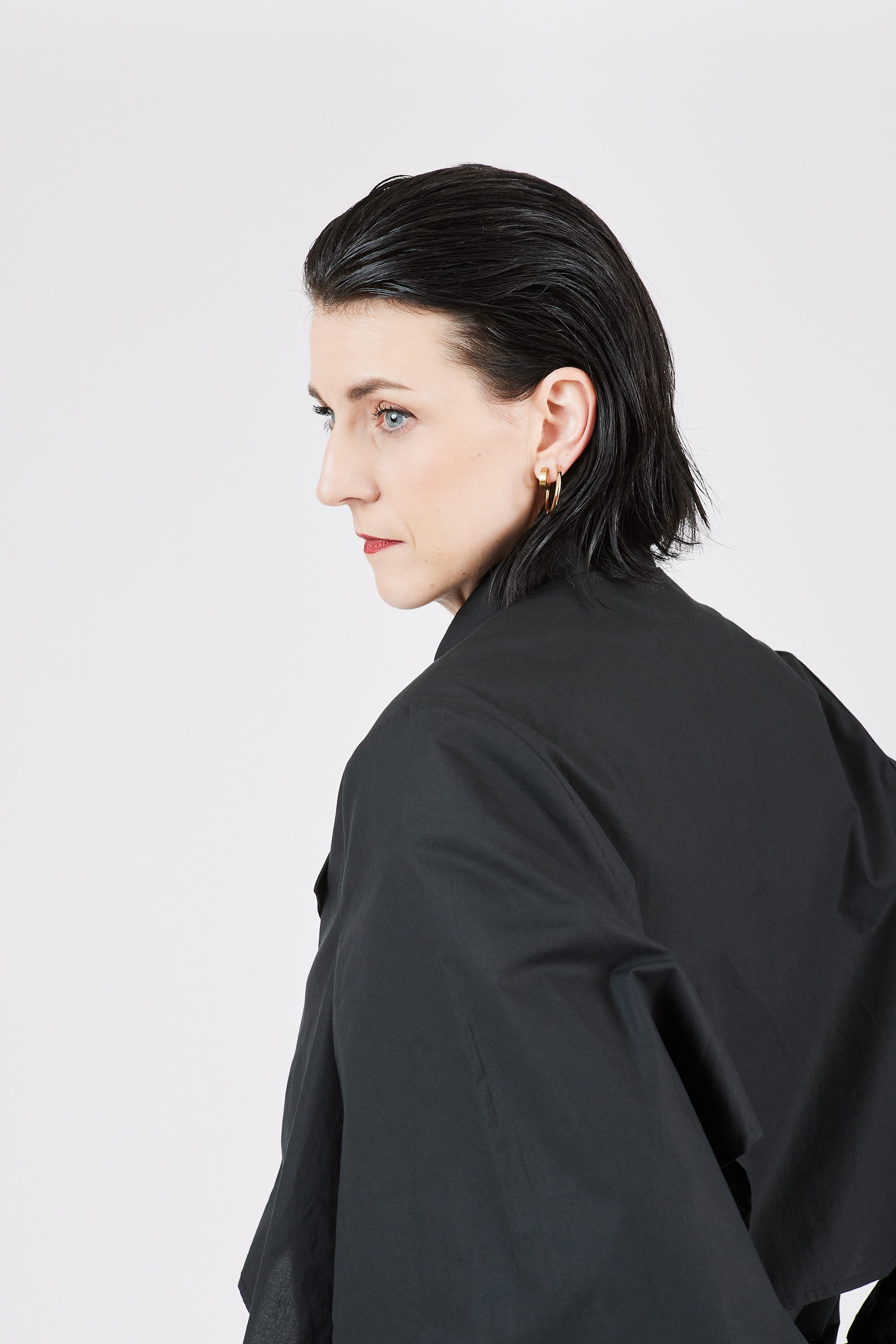 Ein Hybrid aus Hemd und Cape. Offene Seitennähte ermöglichen uneingeschränkte Bewegungsfreiheit, während elastische Bündchen einen lässigen Kontrast zur präzisen Linienführung setzen. Feine Handstiche und schwarz-silberne Druckknöpfe verleihen dem reduzierten Design eine stille Ausdruckskraft.