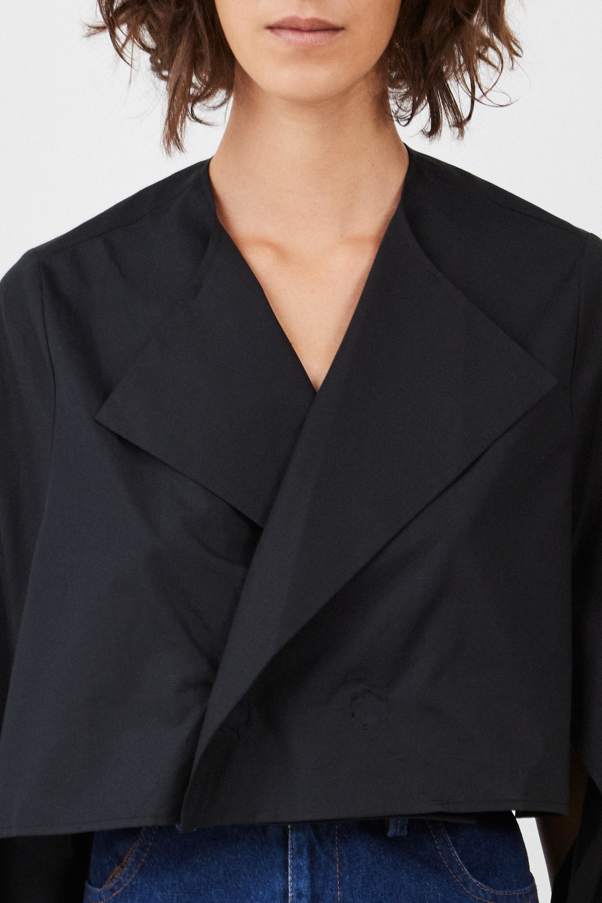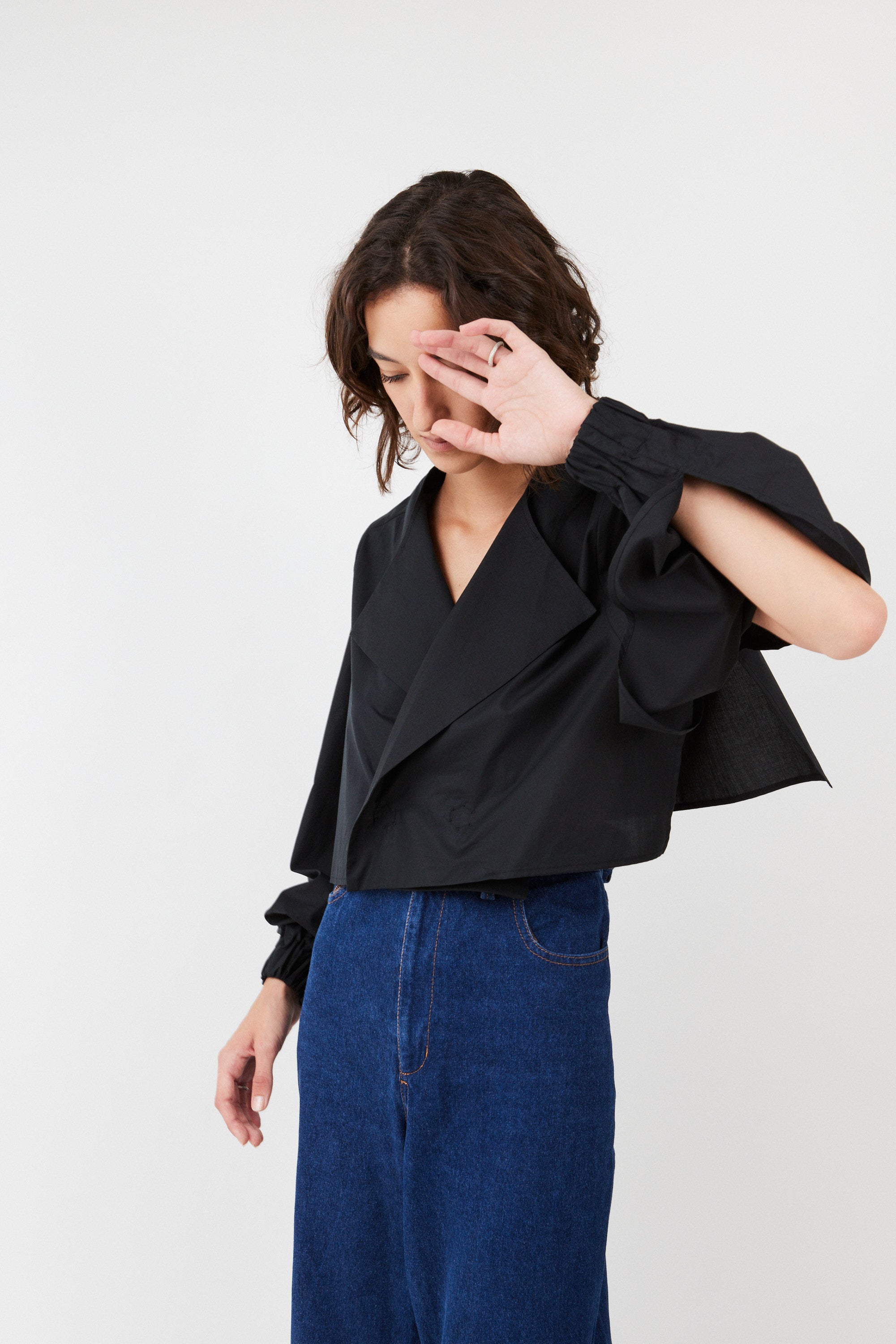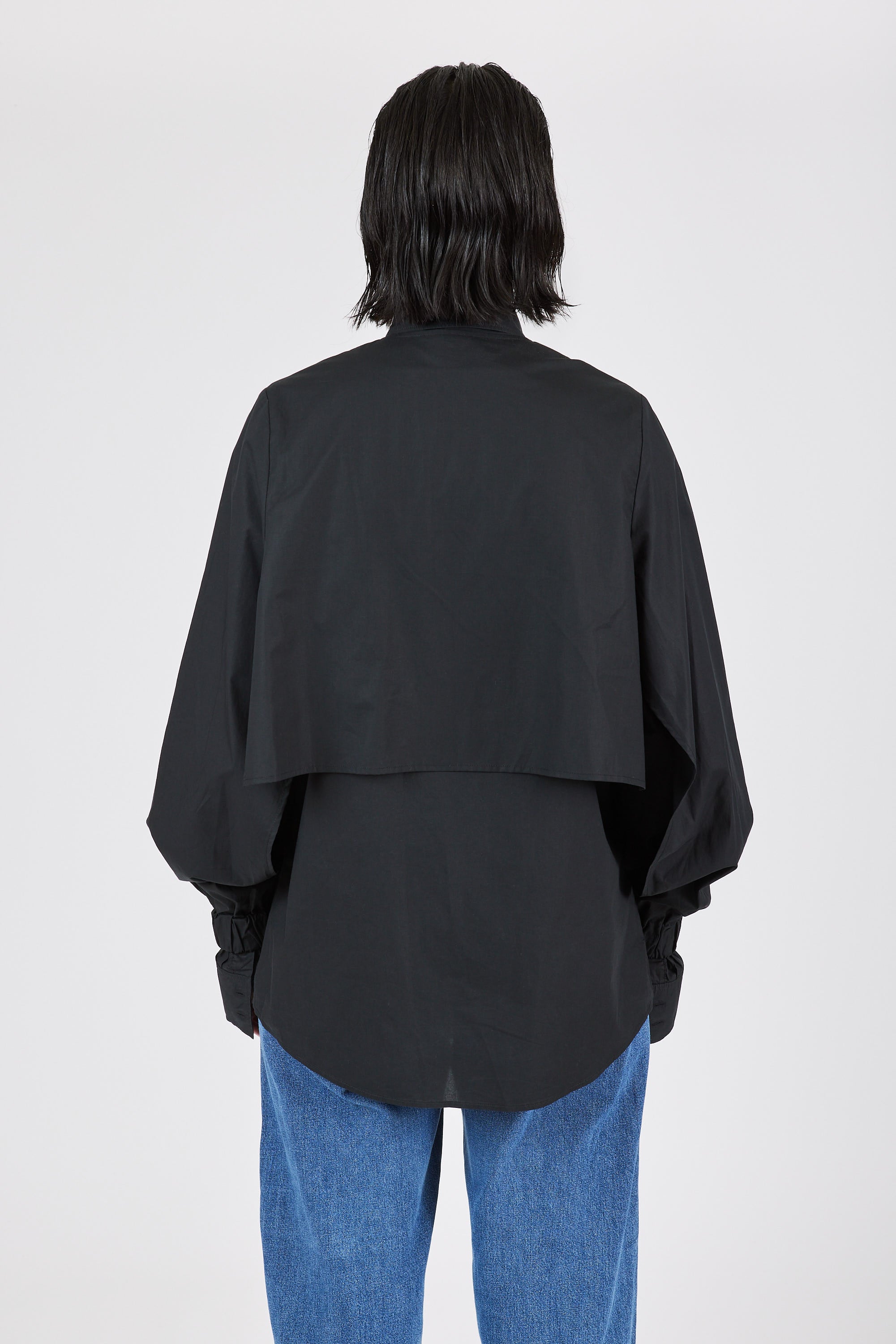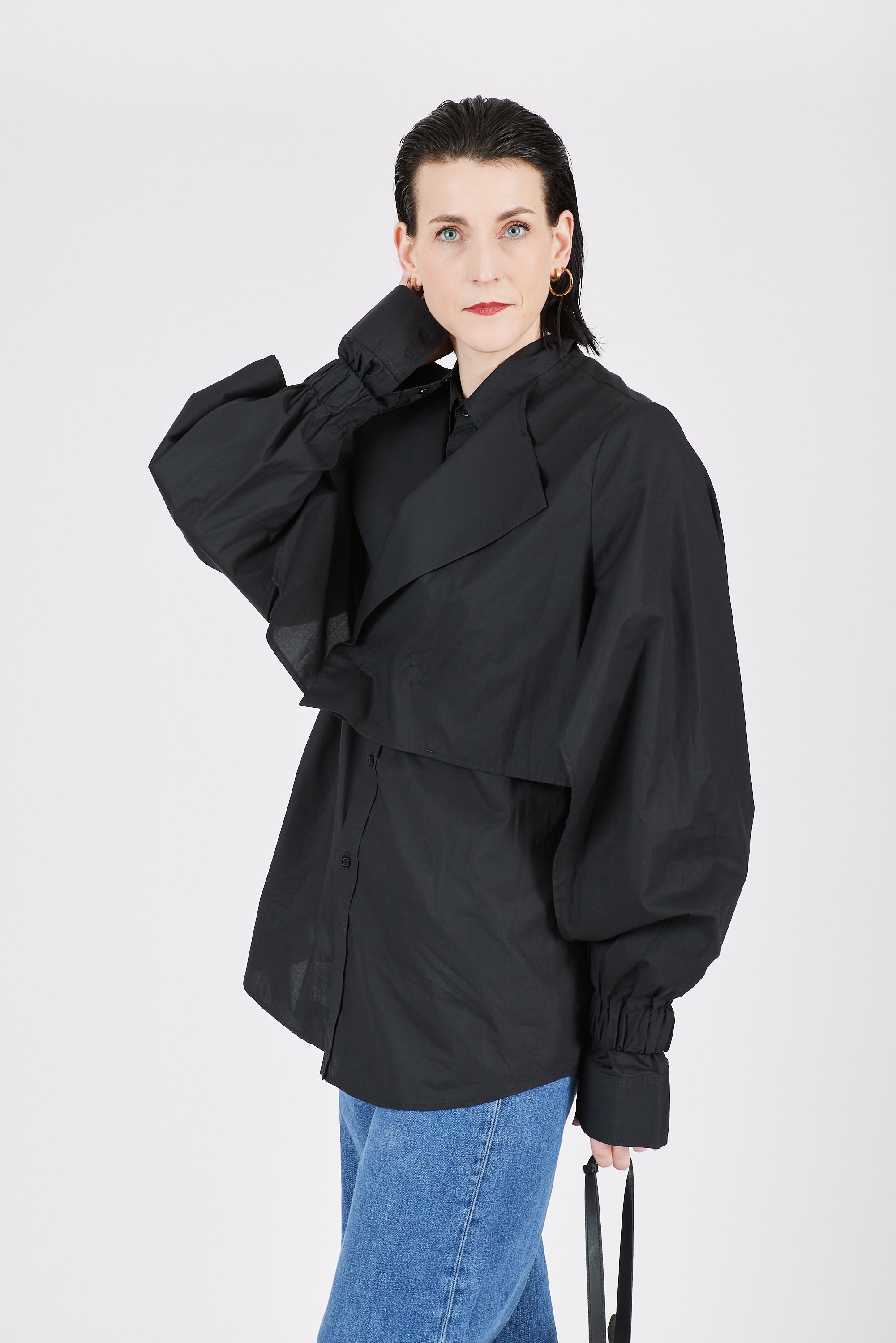 Ein Hybrid aus Hemd und Cape. Offene Seitennähte ermöglichen uneingeschränkte Bewegungsfreiheit, während elastische Bündchen einen lässigen Kontrast zur präzisen Linienführung setzen. Feine Handstiche und schwarz-silberne Druckknöpfe verleihen dem reduzierten Design eine stille Ausdruckskraft.