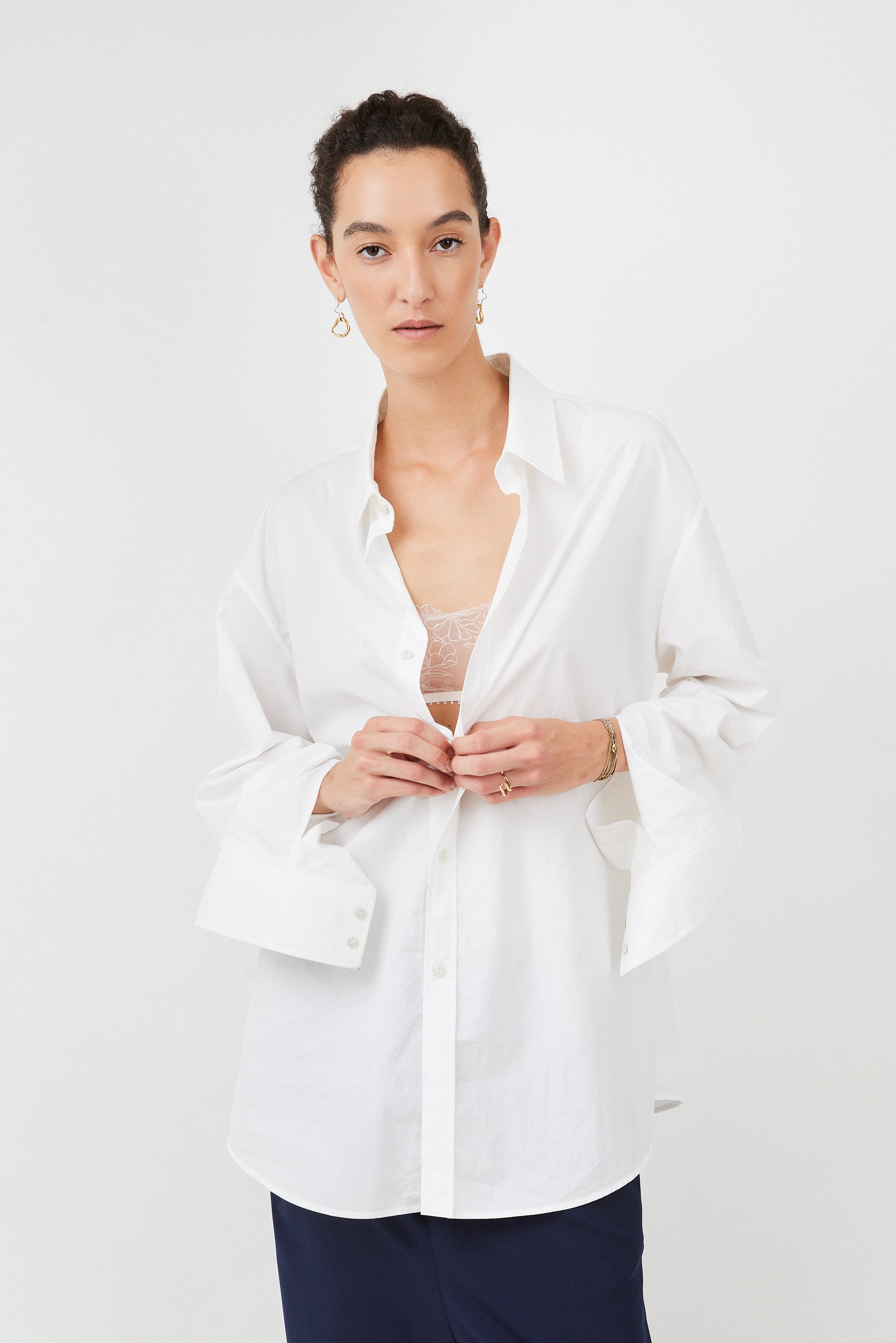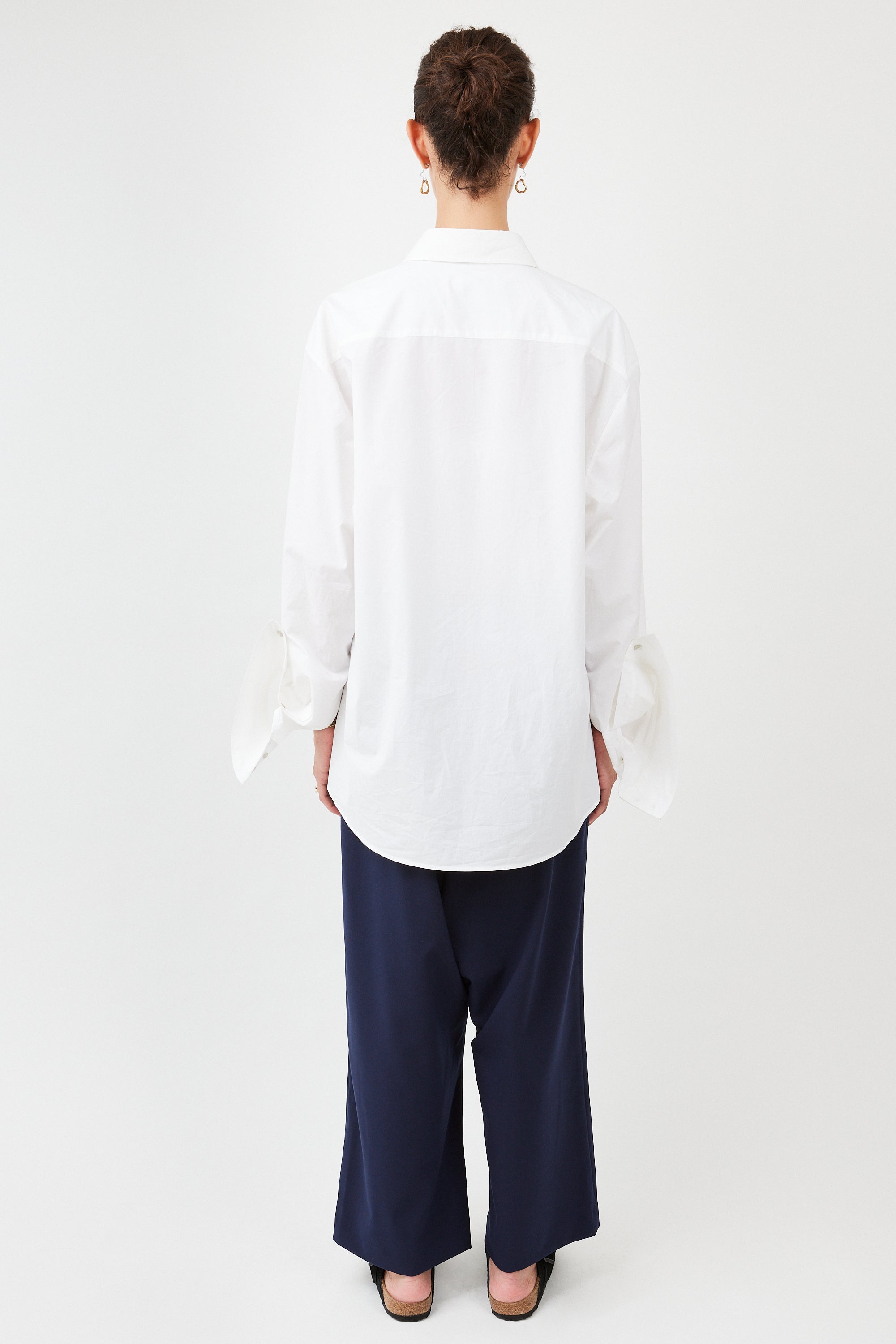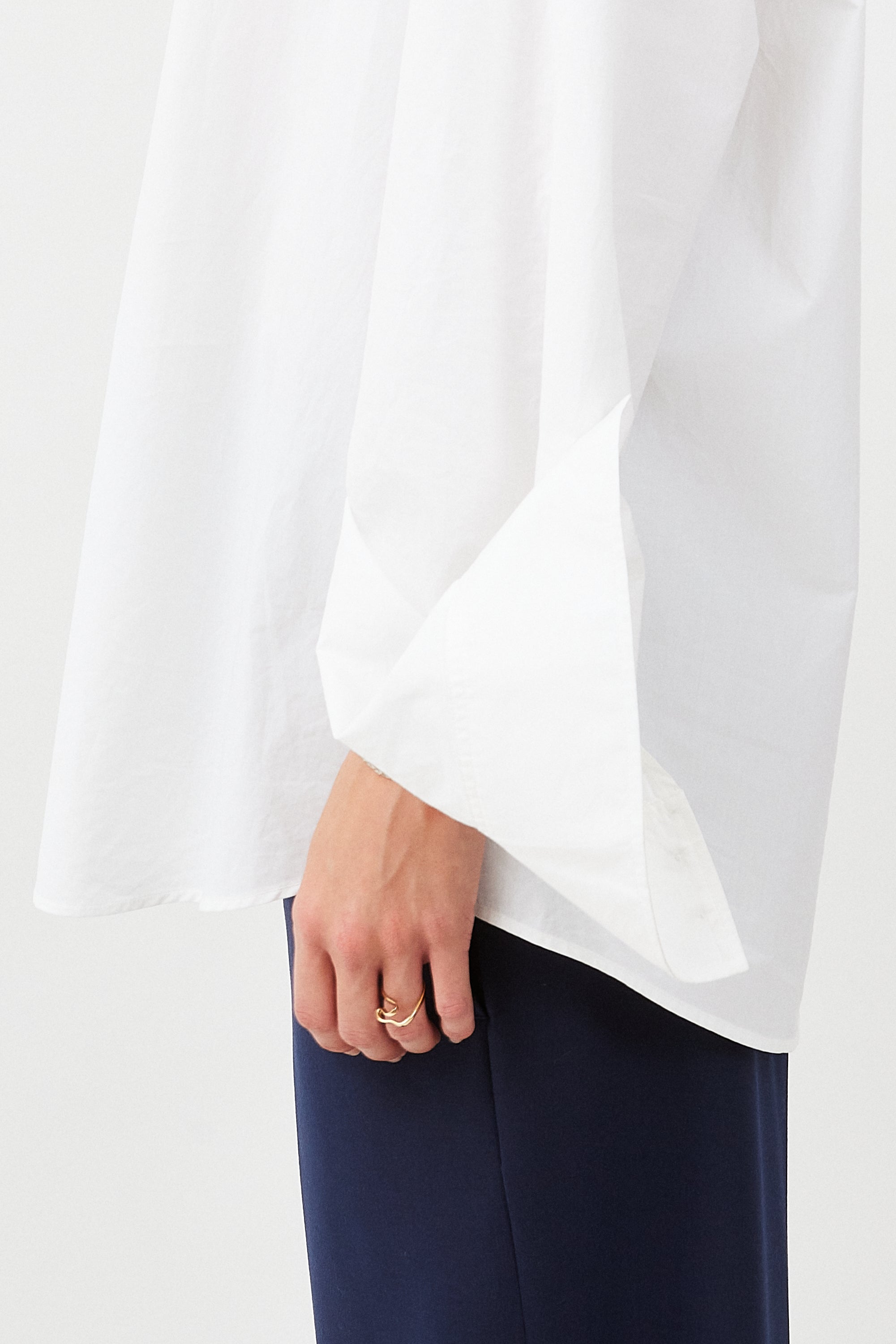 An oversized shirt crafted from the finest Italian cotton poplin; light and soft against your skin. Inspired by a men’s shirt, reimagined with feminine ease, featuring extended sleeves and our signature cuff detail. Cut in Europe from rare deadstock fabric with precise tailoring; it requires more fabric and time than conventional production – a piece made to last, season after season.